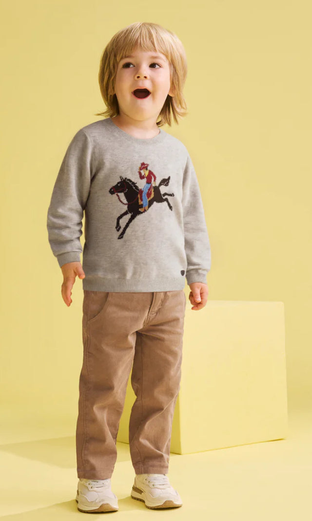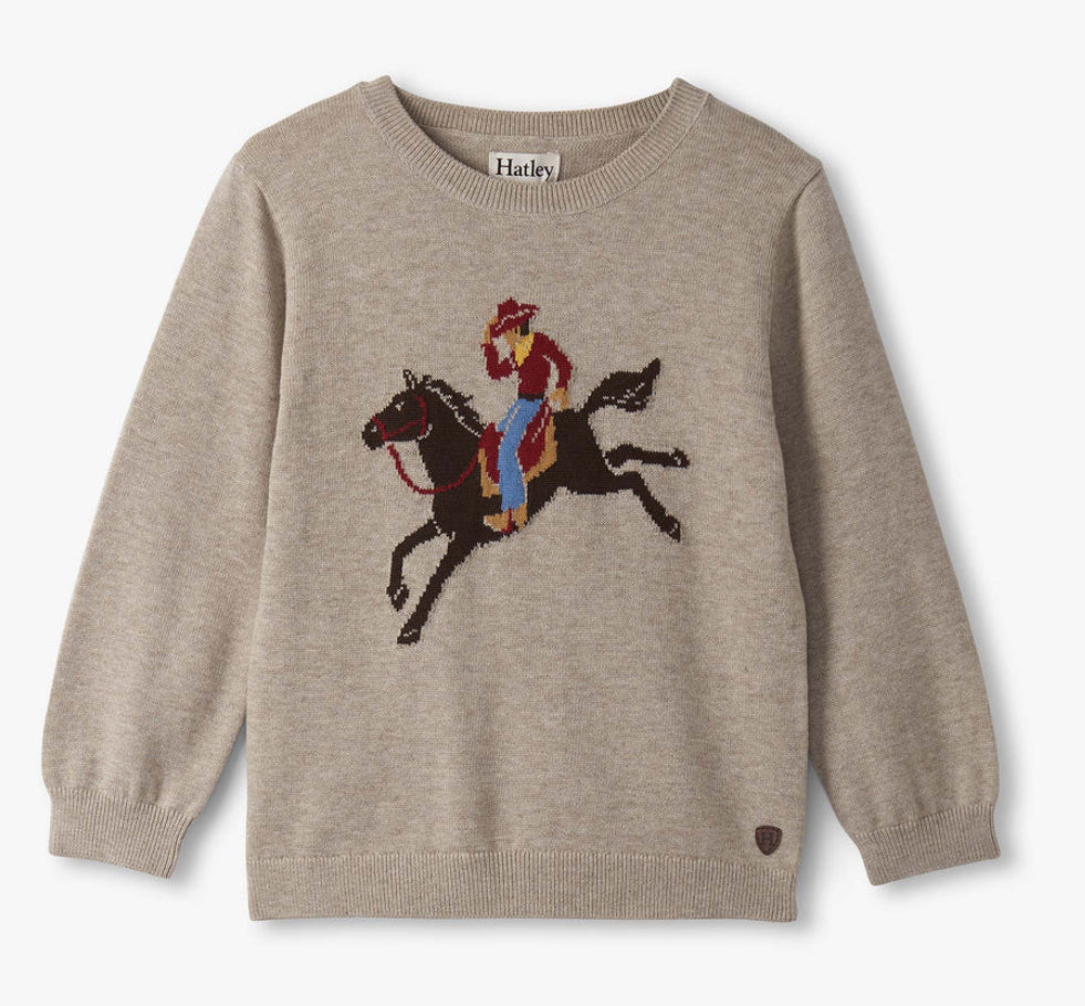 Saddle up for cozy days with this charming ranch-inspired crew neck sweater, featuring a large knit design of a cowboy riding a horse front and center. Set against a soft heathered tan background, the jersey knit body offers a classic, rustic feel that’s as stylish as it is comfy. Made from 100% cotton yarn, it promises breathable warmth and softness, perfect for keeping little wranglers cozy on crisp days. Finished with ribbed cuffs and hem for a secure fit, this sweater is ready for every pint-sized adventure!