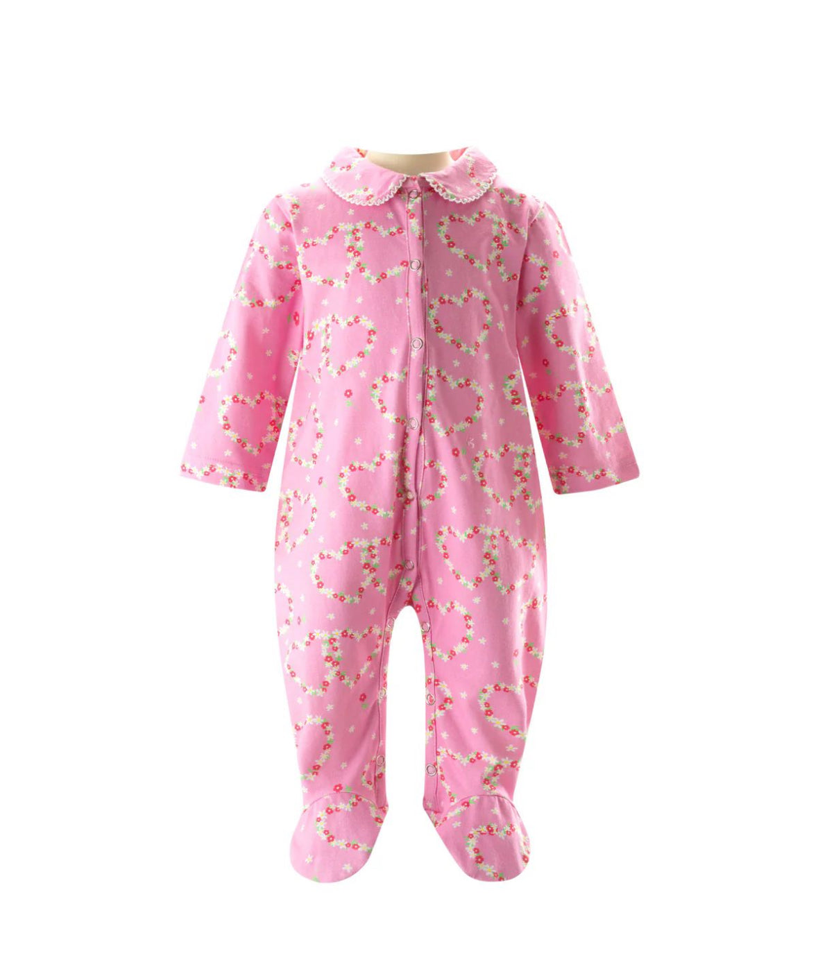 New! Introducing our Daisy Babygro, a soft and snug outfit that your little one will love. With  ivory daisy hearts on bright pink print, this babygro is perfect for sleep time or for comfy and stylish daily strolls. Features snaps fastening, covered foots, and scalloped trimmings for a charming touch.