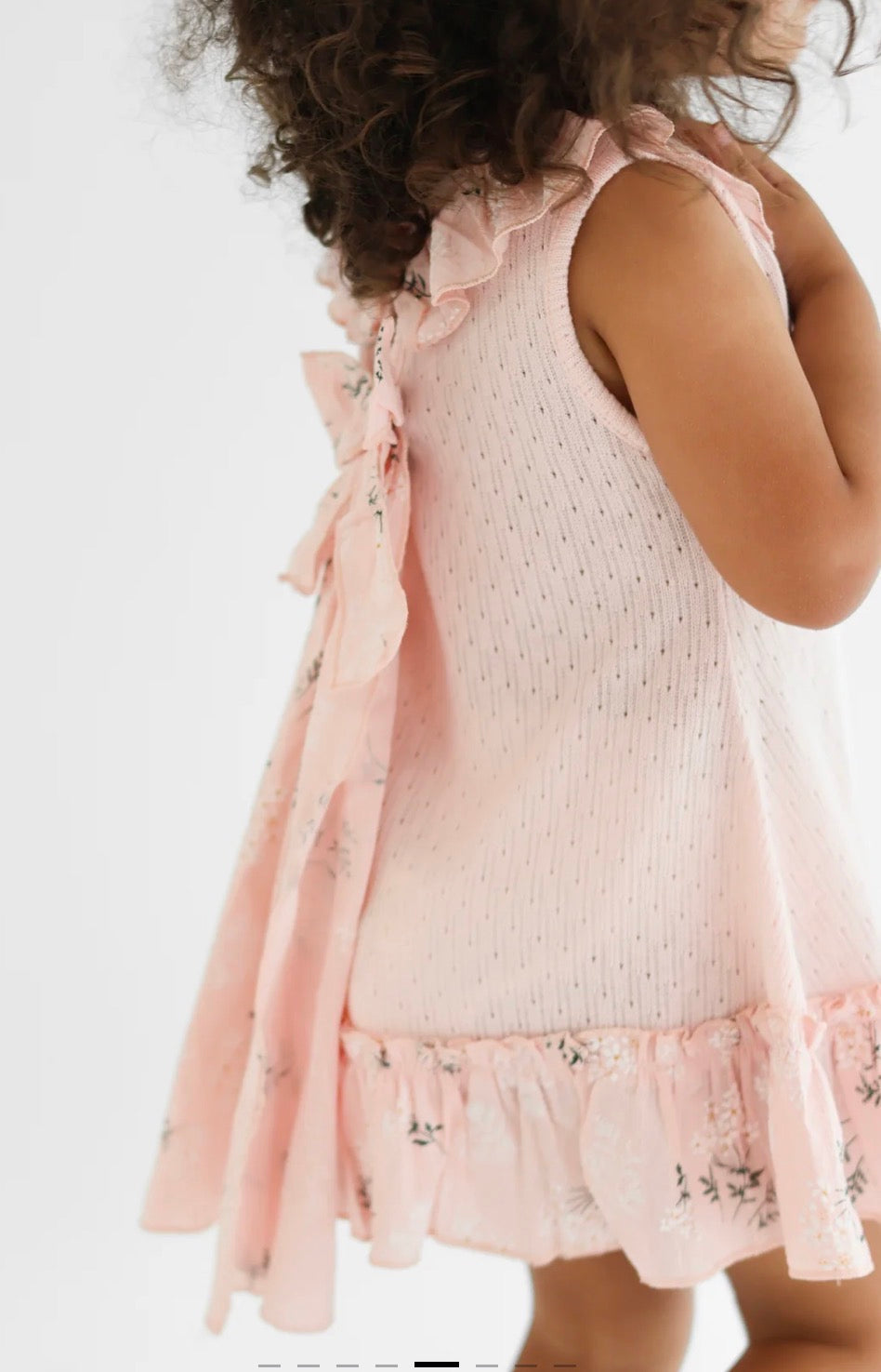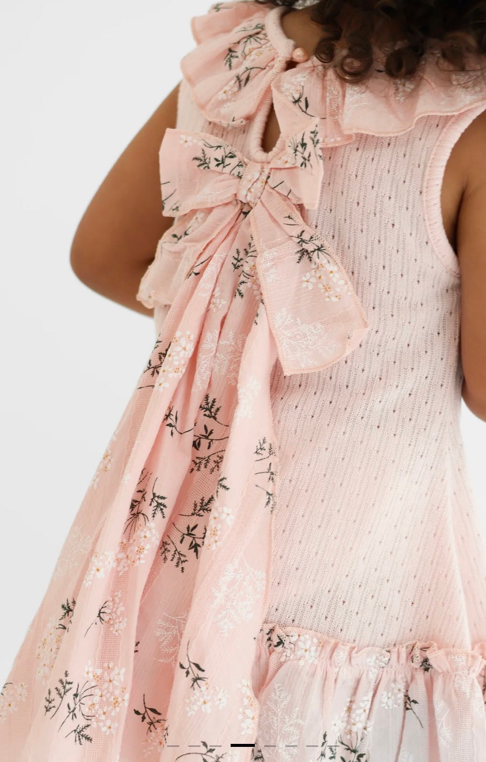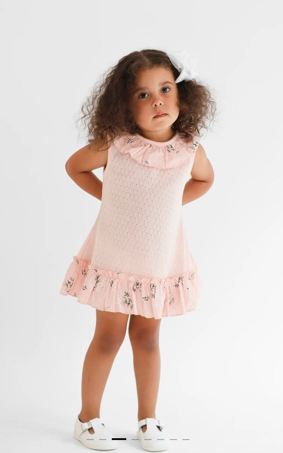 A stunning girls pink knit dress with a floral frilly neck collar and floral waterfall back bow.